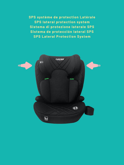 - SAFETY: The Nania car seat is equipped with dedicated safety systems (SPS) and Head-Protect to protect the child as a whole. The SPS or reinforced side protectors protect the child's shoulders and hips. Head-Protect is a headrest that absorbs the energy resulting from an accident. The headrest is adjustable to 12 positions - you can adjust it with just one hand.